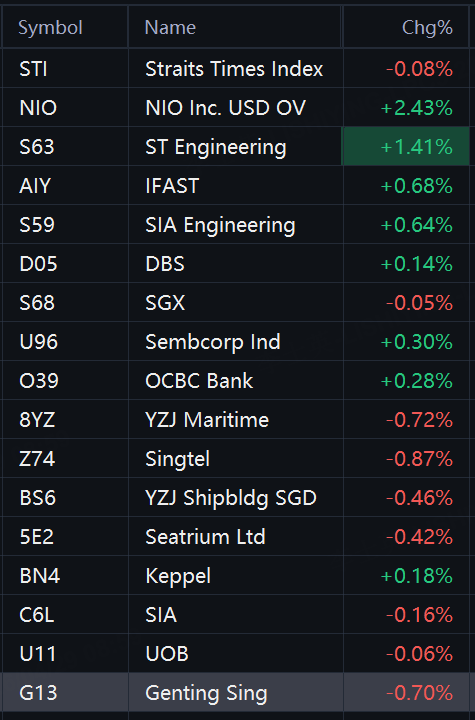 Singapore stocks opened lower on Wednesday. STI fell 0.1%; Nio rose 2%; ST Engineering rose 1%.