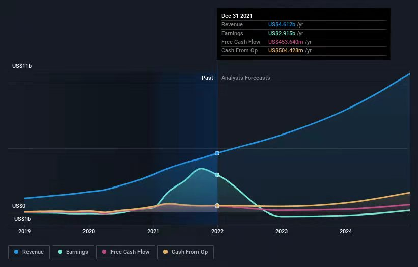 There is also a substantial difference between profits and cash flows, with the latter being important for investors. In the last 12 months, Shopify made US$2.9b in net profit, but only US$453.6b in free cash flows. When estimating which number of the two will converge, in theory we assume that profit converges to cash flows, which is also what analysts are projecting in the chart above.