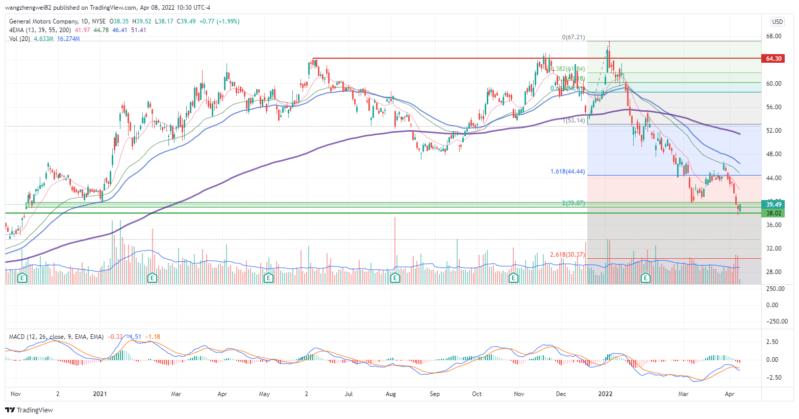$General Motors(GM)$Reached Double Top Target. Also find support at 06 Nov 2020 Restance turned support. For the moment, maybe, the downward momentum might be slowing down. But still downtrend.