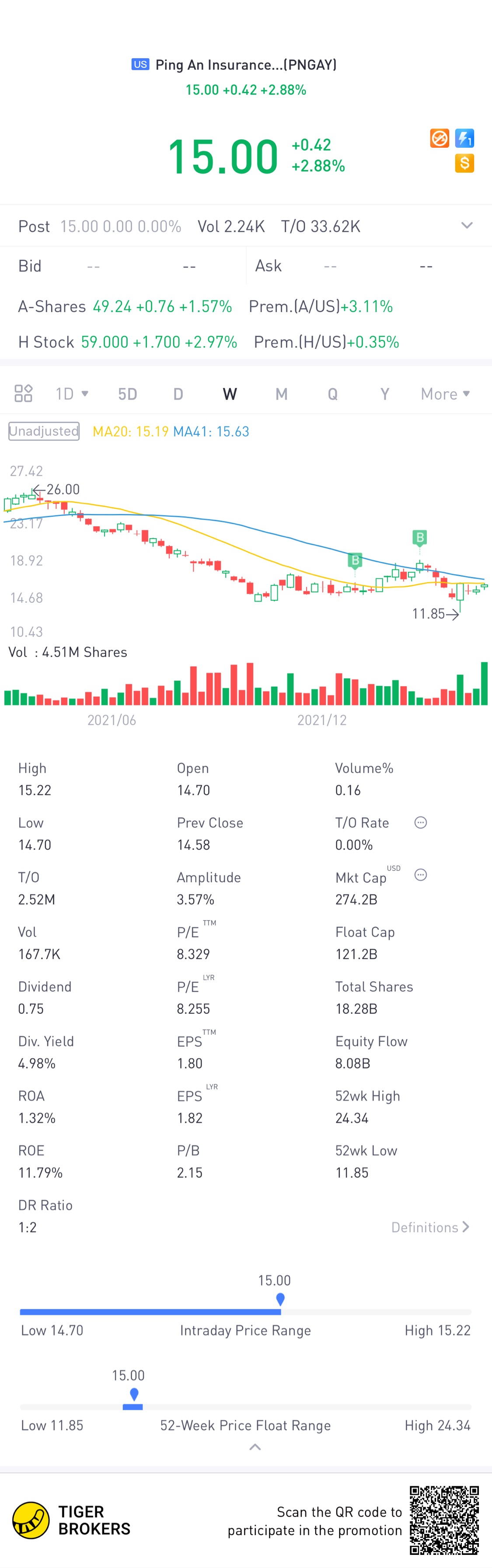 $Ping An Insurance (Group) Company of China Ltd.(PNGAY)$Higher highs on the weekly chart. MAs slowly trending up too. Perhaps green shoots of bottoming with China market hopeful of rate cut