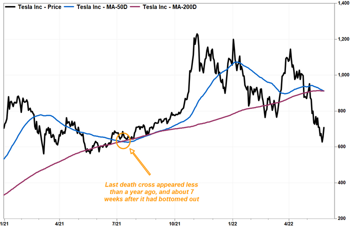 The last death cross appeared on July 9, 2021. The stock closed that day at $656.95, and has gained 7.7% since then. That last death cross had appeared about seven weeks after it hit its final low, after a 36.2%, five-month tumble.
