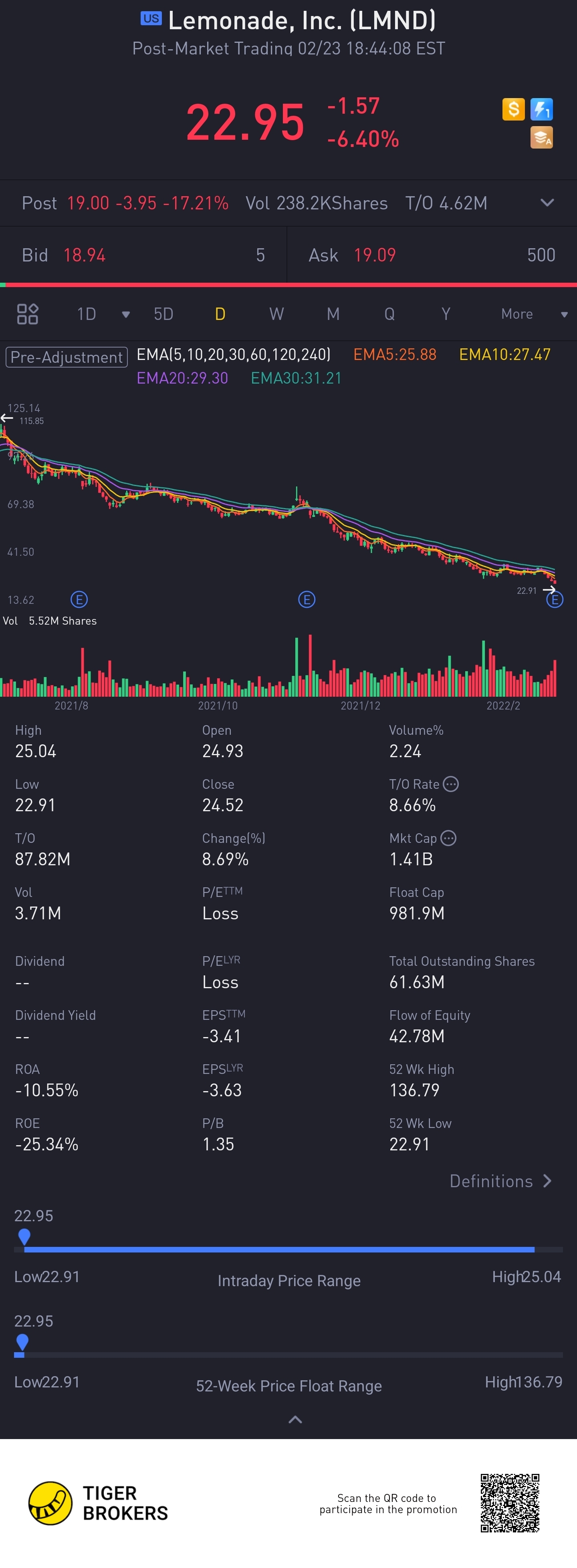 $Lemonade, Inc.(LMND)$after post market drop. LEMONADE already drop 90% from its peak. But the PS ratio still near 20x. Still very high vs current grow rate. I have learnt a lesson, valuation does matter.