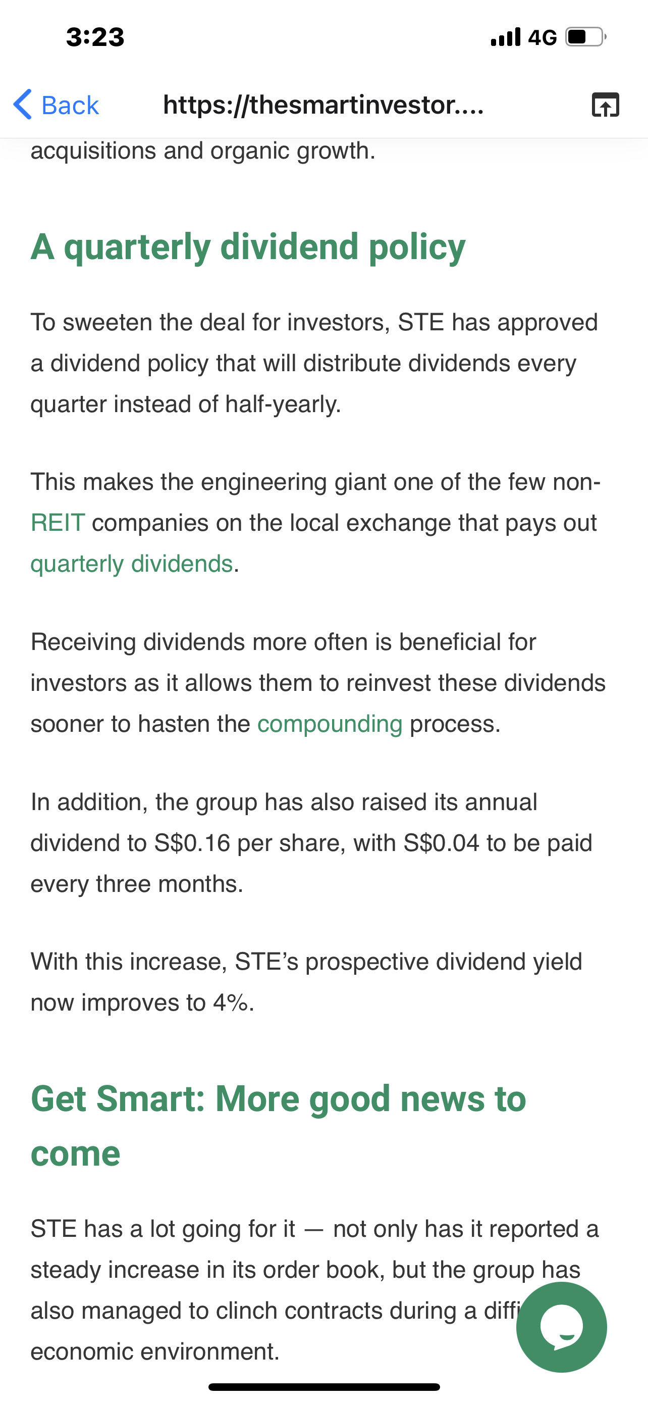$SINGAPORE TECH ENGINEERING LTD(S63.SI)$this defensive stock has approved to change to quarterly dividend payout scheme, also up to 0.16centsfro 0.15cents, which has been last Many many years [Strong]