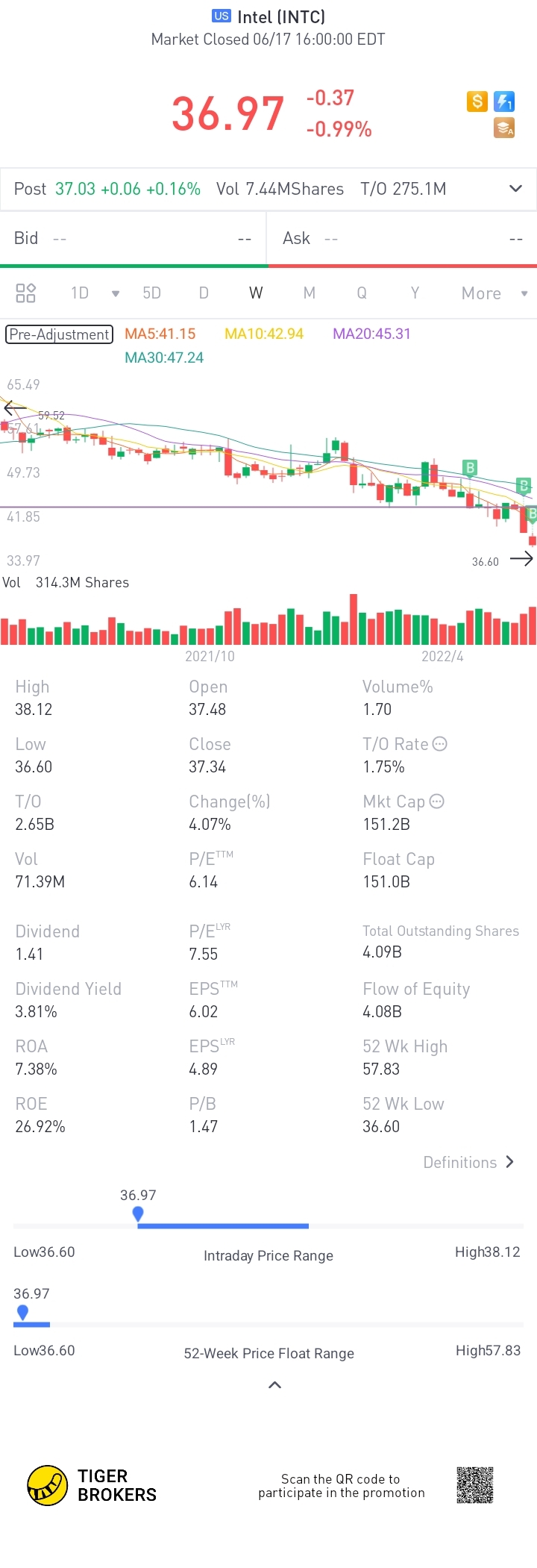 $Intel(INTC)$intel is undervalue, pbv below 1.5 and PE 6. We still need a lot of chip in the future. There will be growth in intel revenue, so it will be good to avg down in this bearish market.