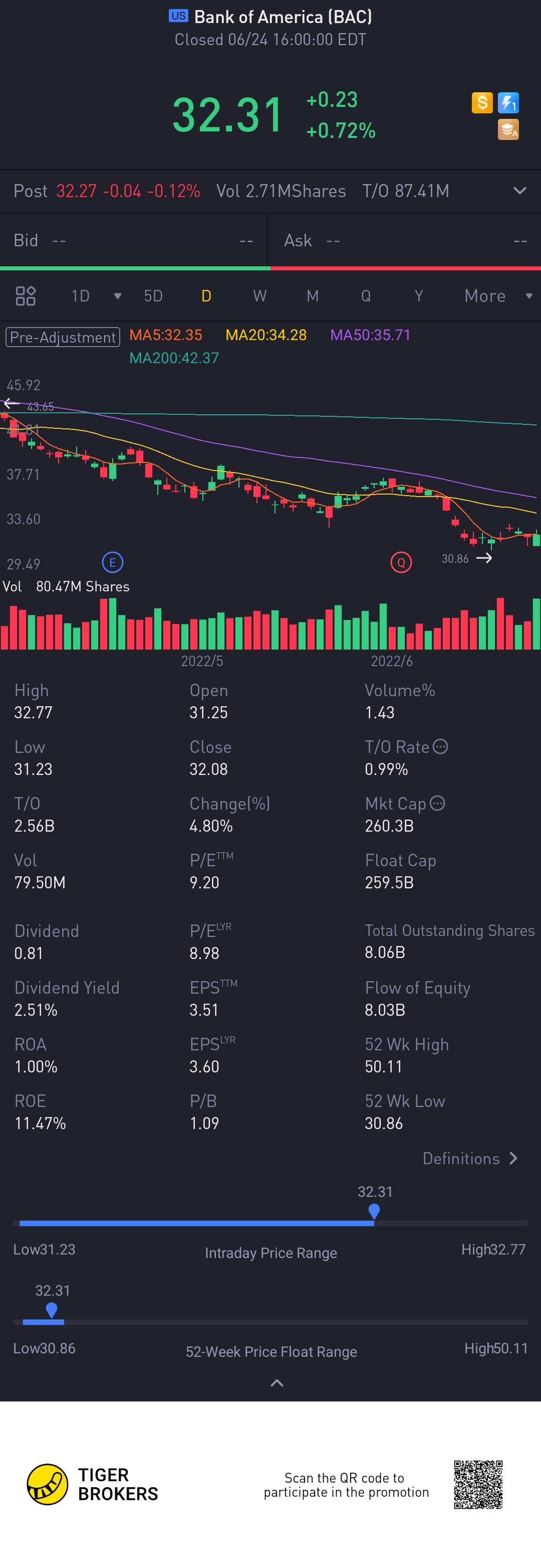 $Bank of America(BAC)$With earnings report out in about 3 weeks time, it might be a good time to look into this share now especially when PE = 9++ now.[Happy]