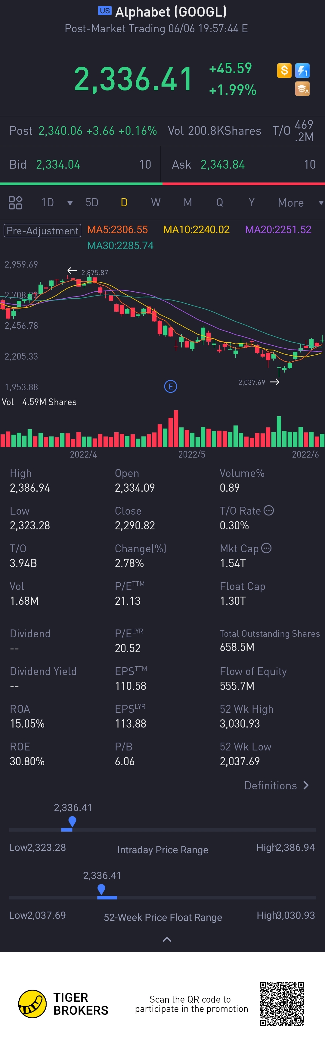 $Alphabet(GOOGL)$it hit a high 2386 last night, was eagaerly waiting for it to break the 2400 barrier. Hope that tonight we can see that!