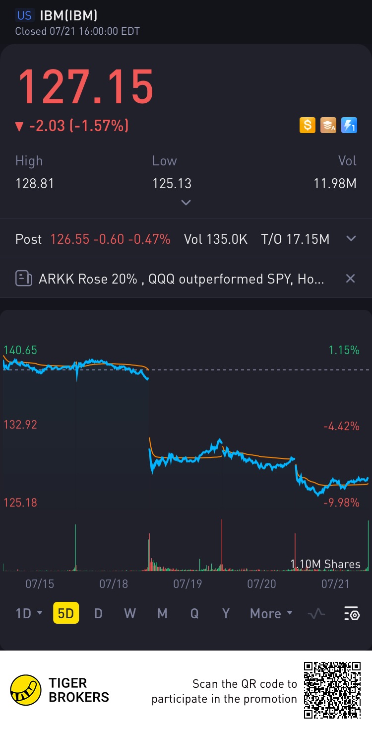 $IBM(IBM)$Dip Dip Dip!!! Now I'm buying it everyday. Really looking forward to rise that may happen within couple of month based on past chart and their business activities.