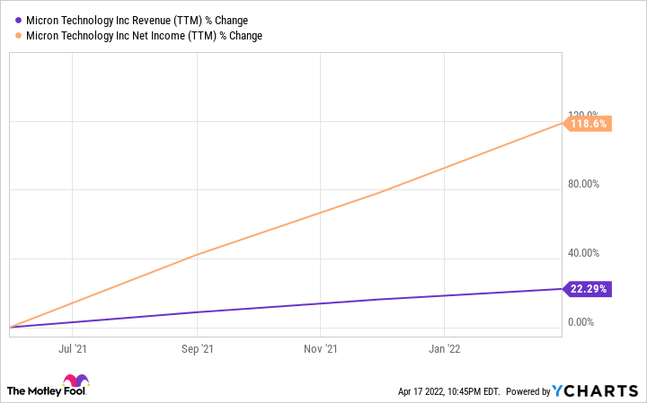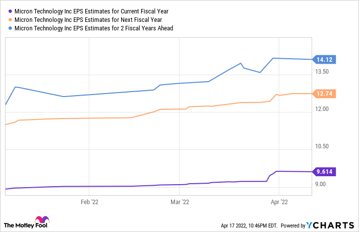Analysts expect Micron to finish fiscal 2022 with $33.7 billion in revenue, an increase of 21.7% over last year, followed by a 20% revenue increase in fiscal 2023. The company's bottom line is also expected to head higher after last fiscal year's adjusted earnings of $6.06 per share.
