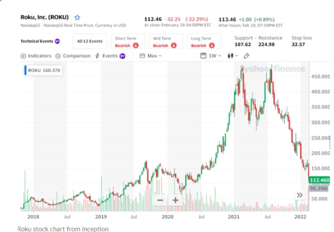 Topping that list is Roku, which suffered the same fate as Meta Platforms (FB), parent company of Facebook, during the quarter when Apple rejiggered its operating system to require opt-in from consumers for cross-app tracking. Also weighing on Roku stock are supply chain issues for its in-TV devices along with a substantial and costly commitment for investment this year.
