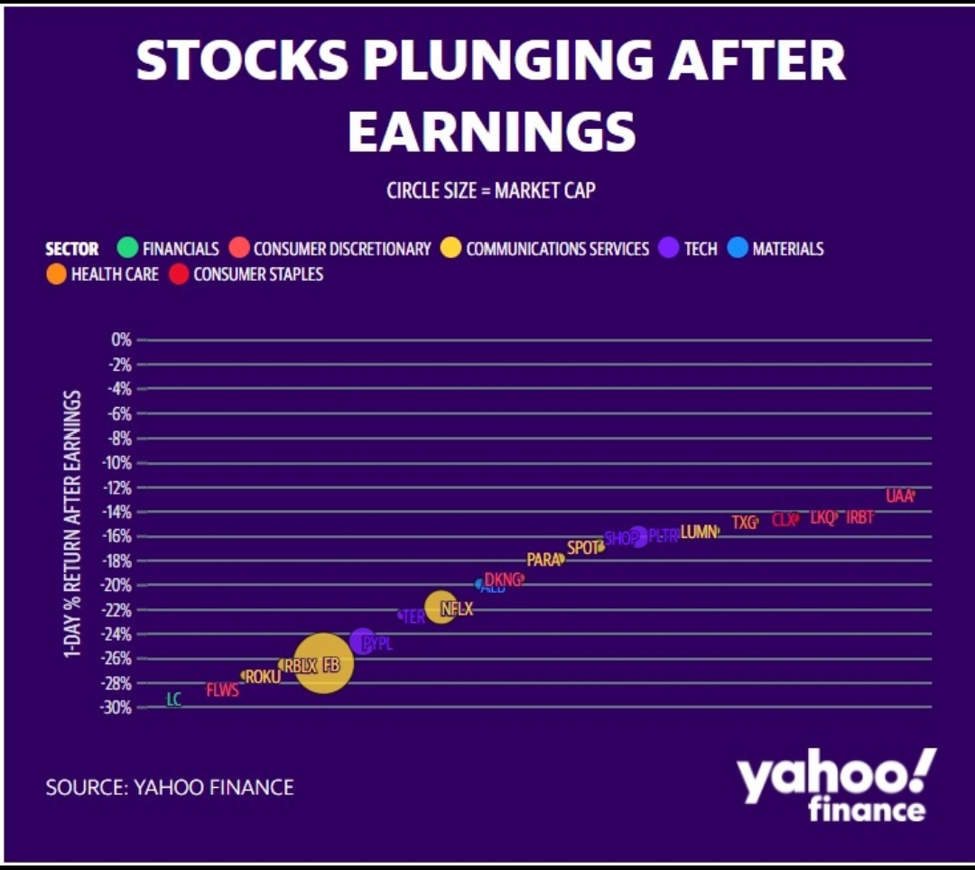 Friday, another round of jaw-dropping stock sell-offs after earnings announcements hit the tape, when Roku (ROKU) stock plunged 23% and DraftKings (DKNG) cratered 22% — the second-worst one-day performance for both stocks. Nightmare earnings reactions have been a theme this quarter, as investors seize on concerns over slowing growth prospects for companies over a wide range of industries.