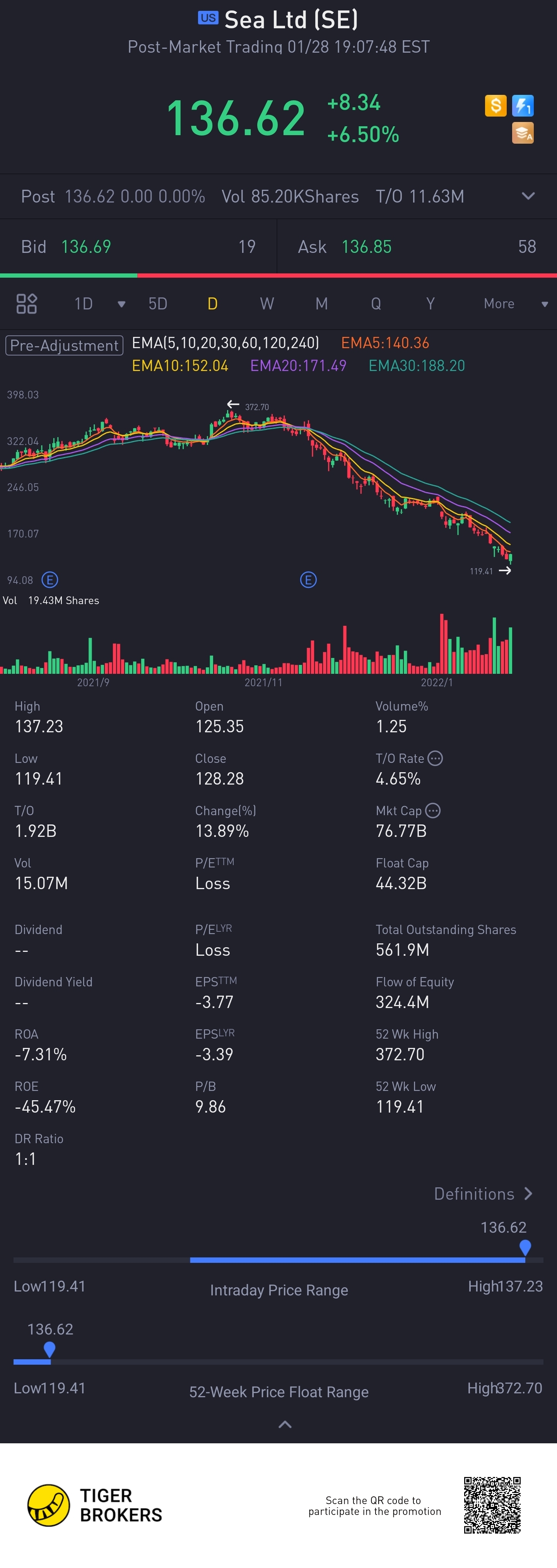 $Sea Ltd(SE)$picked up some stock yesterday at $125. Wake up closing at 136. Happy weekend [LOL] . Next week will drop again?