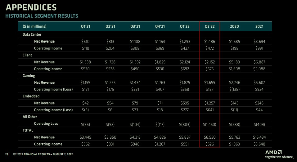 Starting in the second quarter, AMD updated the financial segment reporting to align with the four strategic end markets: data center, client, gaming and embedded. Q2 revenue growth of each segment was improving, led by significant improvement in data center and embedded sales and operating margin.