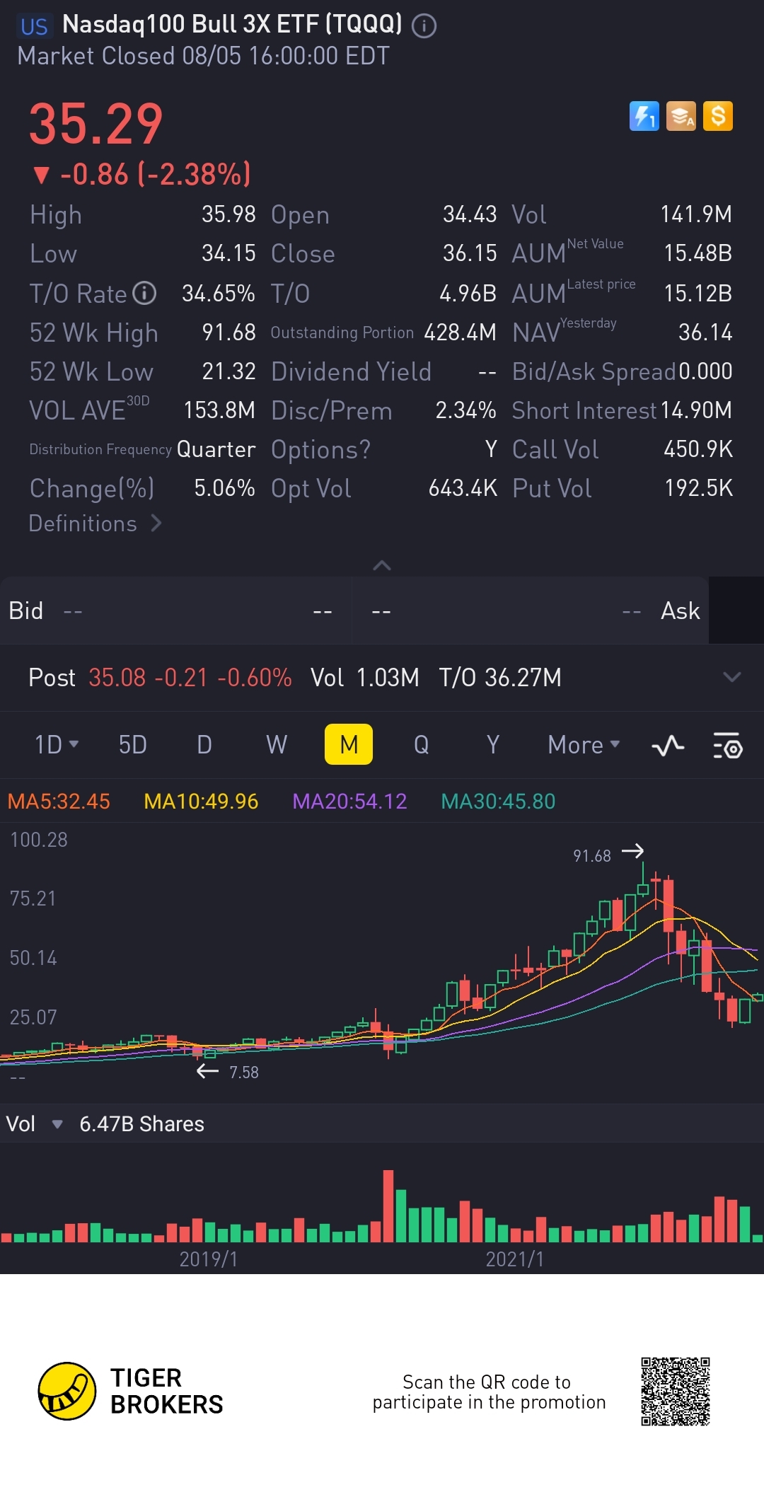 $Nasdaq100 Bull 3X ETF(TQQQ)$Good options play. Everyone should check this out. I have been earning monthly premium of more than 2% for selling put 25% discount to the current price.