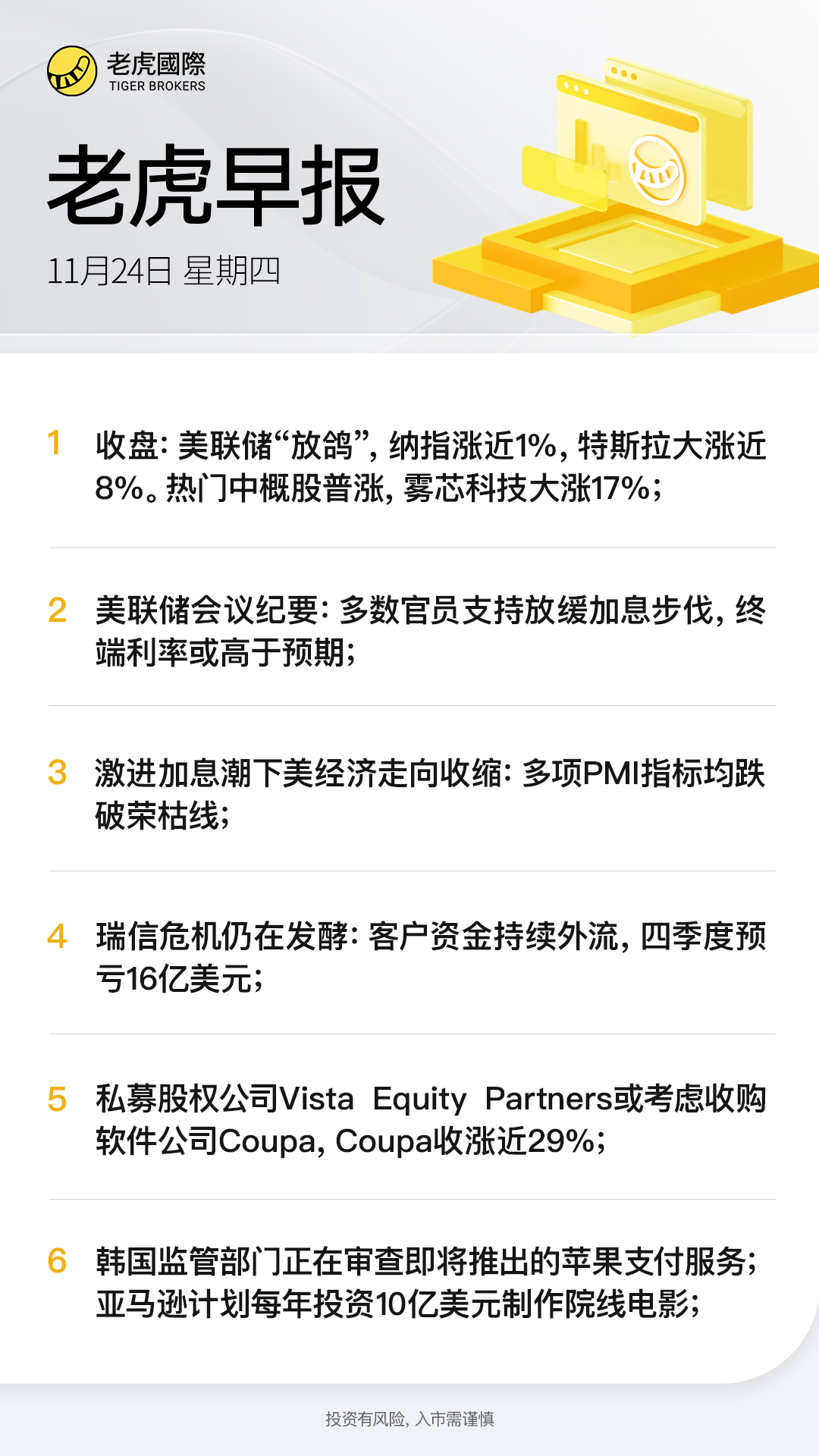 1、联储纪要暗示放缓加息美股集体收高纳指涨近1%
