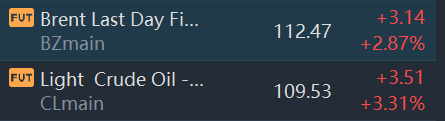 WTI crude rose 3.3% to $109.53 a barrel, Brent rose 2.87%.