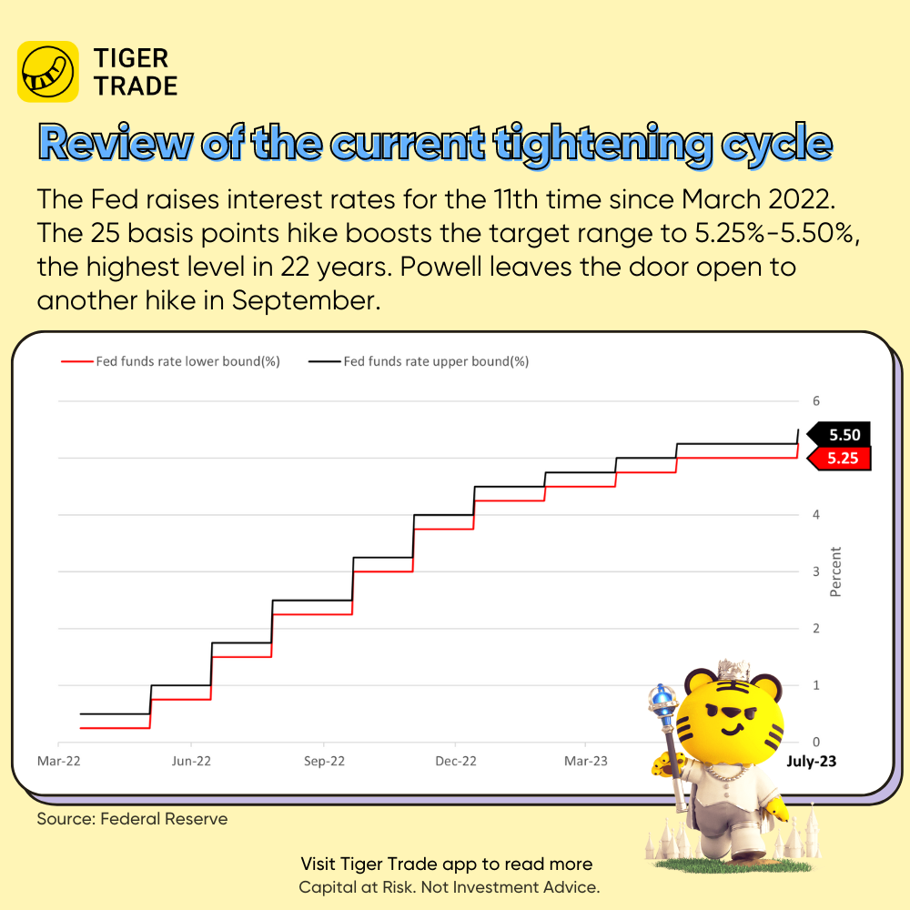 The Fed raises interest rates for the 11th time since March 2022 to curb inflation. The 25 basis points hike boosts the target range to 5.25%-5.50%, the highest level in 22 years. The chart below shows the rate path of the current tightening cycle.