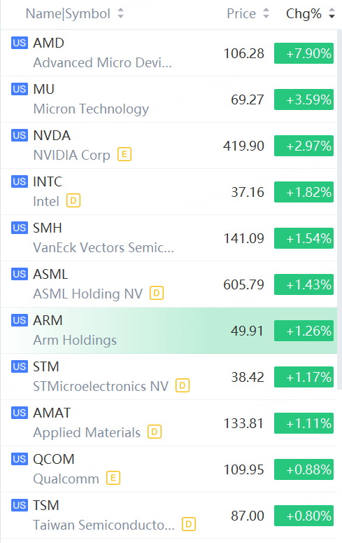AMD rose nearly 8%; Micron rose over 3%; Nvidia rose nearly 3%; Intel, ASML, Arm Holdings rose over 1%.