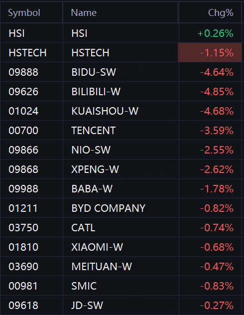 tech stocks dropped in Hong Kong. HSTECH fell 1.2%; Bilibili, Kuaishou, and Baidu fell 5%; Tencent fell 4%; XPeng and NIO fell 3%; Alibaba fell 2%.