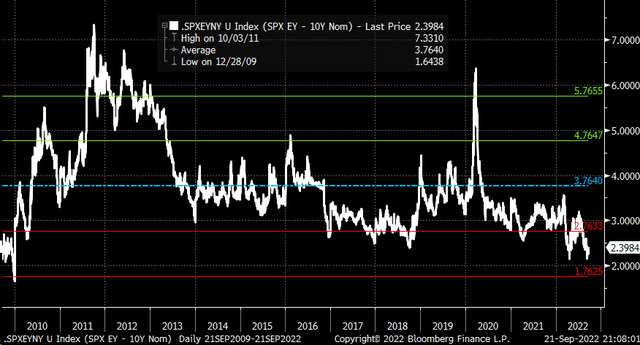 But that's the thing - it all depends on where rates go because if rates do rise as the Fed suggests, and the 2-yr gets to around 4.5% and assuming the curve remains inverted by 50 bps, the 10-Yr would trade with a 4% yield, and then, of course, that would imply an even higher earnings yield for the S&P 500, and lower PE ratio.