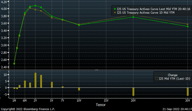 The shift in the futures market should feed through to the Treasury curve. Treasuries are already beginning to rise further with the 2-Yr and 3-Yr gaining and now above 4%. Based on the Fed projections, they would suggest we're likely to see the two and three-year Treasuries not only stay above 4% but well above 4%, potentially matching those peak terminal rates of 4.6% the Fed is forecasting.
