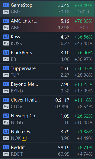 Meme stocks soared again in premarket trading Tuesday. GameStop rose 160%; AMC Entertainment rose 150%; Koss rose 44%; Blackberry rose 31%.