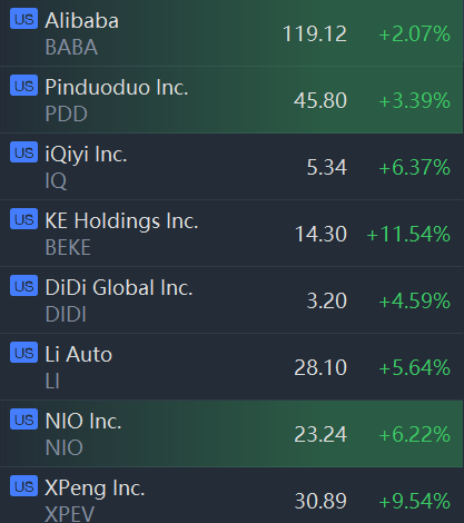 Some hot Chinese ADRs gained in morning trading. Alibaba, Pinduoduo, iQIYI, KE Holdings, DiDi Global, Nio,Xpeng Motors and Li Auto climbed between 2% and 12%.