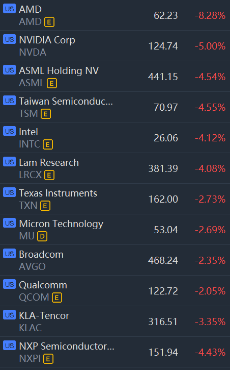 AMD dragged chip stocks in morning trading Friday. AMD fell 8%; Nvidia fell 5%: ASML, TSMC, Intel and Lam Research fell 4%.