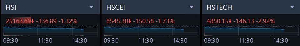 Hong Kong stock market extended losses. Hang Seng Index down 1.32%, the Hang Seng Tech Index down 2.92%.