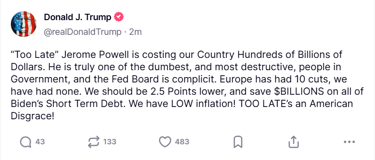 "Jerome Powell is costing our Country Hundreds of Billions of Dollars... We should be 2.5 Points lower," he said in a Truth Social post, referring to the Federal Reserve chair.