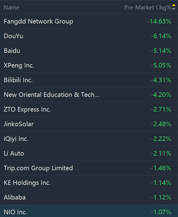 Alibaba, Nio, Li Auto, Baidu, Bilibili, Douyu and iQiyi fell between 1% and 7%.