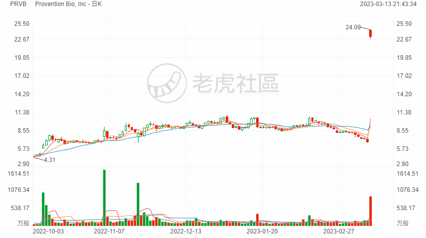 生物制药公司Provention Bio暴涨超240%,最高触及24.09美元。消息面上,赛诺菲将以每股25美元现金收购该公司。