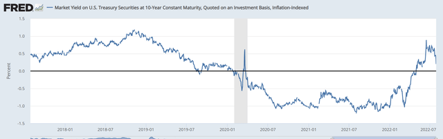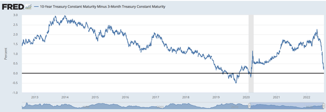 - On May 30, I recommended to start buying S&P 500, with SPY at 413, and continued to recommend buying S&P 500 on June 27with SPY at 388, and July 18 with SPY at 388. The bullish thesis was also very simple: we were past the peak inflation and expected to be past the peak headline inflation given the falling commodity prices, and thus, past the Fed hawkishness. Further, given the still positive yield curve spread between the 10Y Treasury Bond and the 3-month Treasury Bill, the probability of an imminent recession was very low. Thus, I expected at least a nice (and significant) counter-trend summer rally.