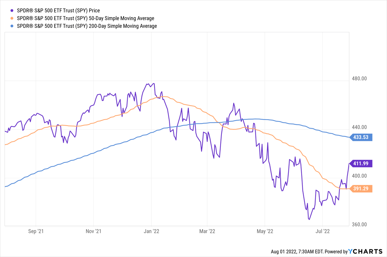 Since reaching the (cycle) bottom on June 16th, S&P 500 is up almost 13%, and SPY is currently at 411 near the breakeven of my May 30th buying point, and significantly higher than my June 27th and July 18th buying points. I am willing to take profits on these long positions. Here is the SPY chart that illustrates the significant countertrend bounce to the top range: