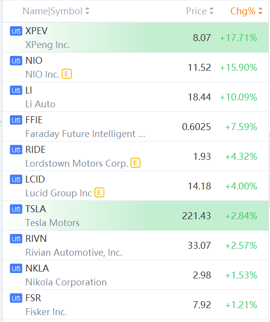 EV stocks jumped in morning trading. Xpeng rose over 17%; Nio rose over 15%; Tesla rose nearly 3%.