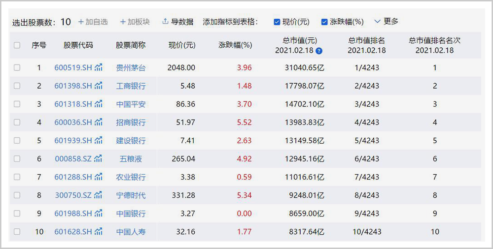 ▲2021年2月18日A股总市值前10