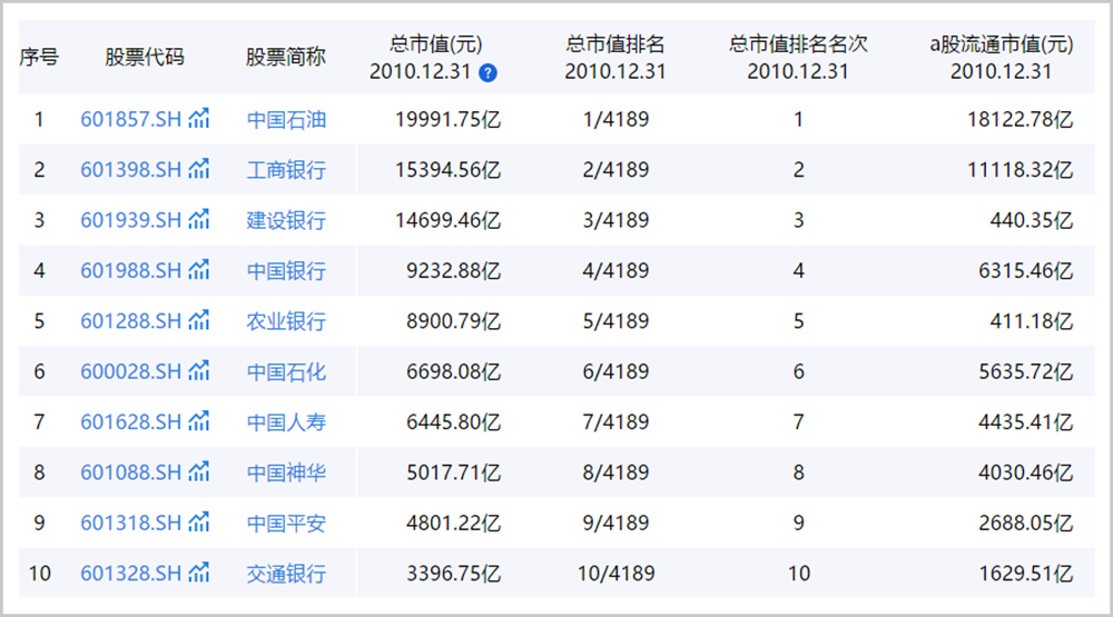▲2010年12月31日A股总市值前10