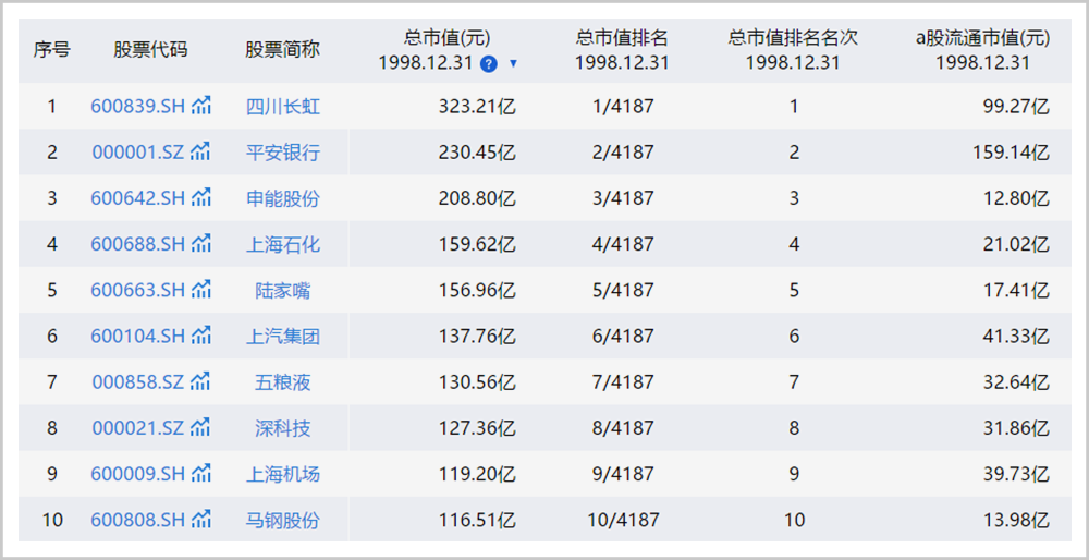 ▲1998年12月31日A股总市值前10