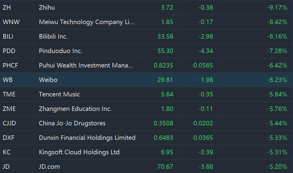 Alibaba, Pinduoduo, Bilibili, Zhihu, JD.com and Tencent Music fell between 4% and 10%.