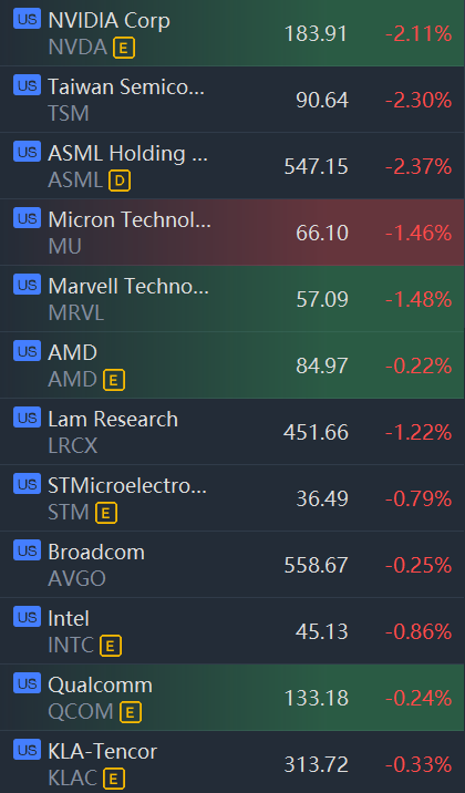 Semiconductor stocks slid again. Nvidia, TSMC and ASML fell more than 2%.