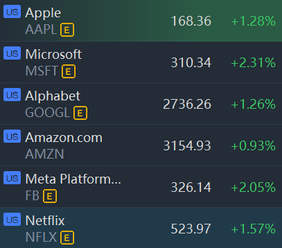 Big tech stocks gained in morning trading.Apple, Microsoft, Alphabet, Amazon, Meta Platforms and Netflix climbed between 1% and 2%.