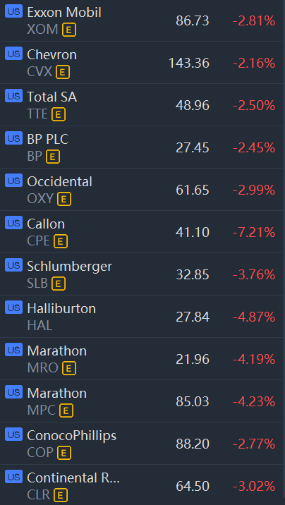 Oil stocks slid in morning trading. Exxon Mobil, Chevron, Total SA, BP, Occidental, Marathon, Callon, Schlumberger, Halliburton and ConocoPhillips fell between 2% and 7%.