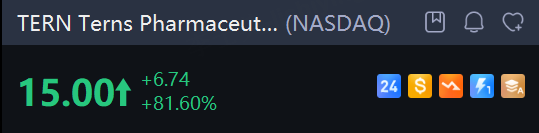 Terns Pharmaceuticals stock surged 81.6% in morning trading on Monday after the clinical-stage oncology company reported promising data from its ongoing CARDINAL trial of TERN-701, a novel investigational allosteric BCR::ABL1 inhibitor for chronic myeloid leukemia (CML).