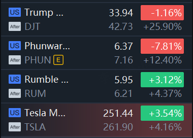 Trump-linked Stocks soared in extended trading. Trump Media & Technology rose 26%; Phunware rose 12%; Rumble Inc. and Tesla Motors rose 4%.