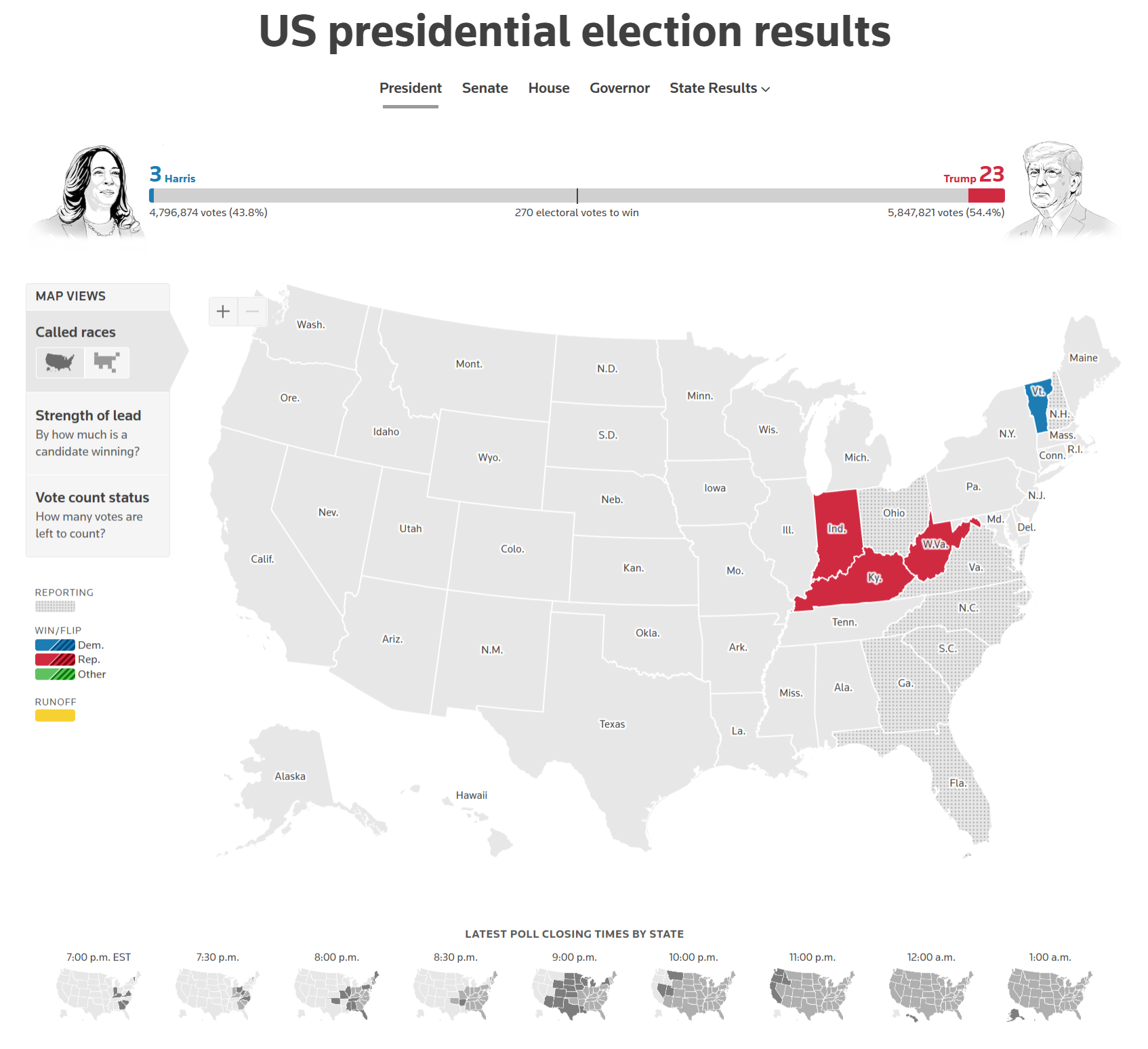 The Associated Press reports that Trump won Indiana, Kentucky and West Virginia in the election, while Harris won Vermont.