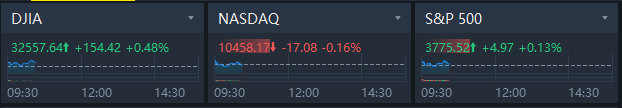 U.S. stocks mixed in morning trading; Dow Jones jumped 0.48%, S&P 500 rose 0.13% while Nasdaq slid 0.16%.