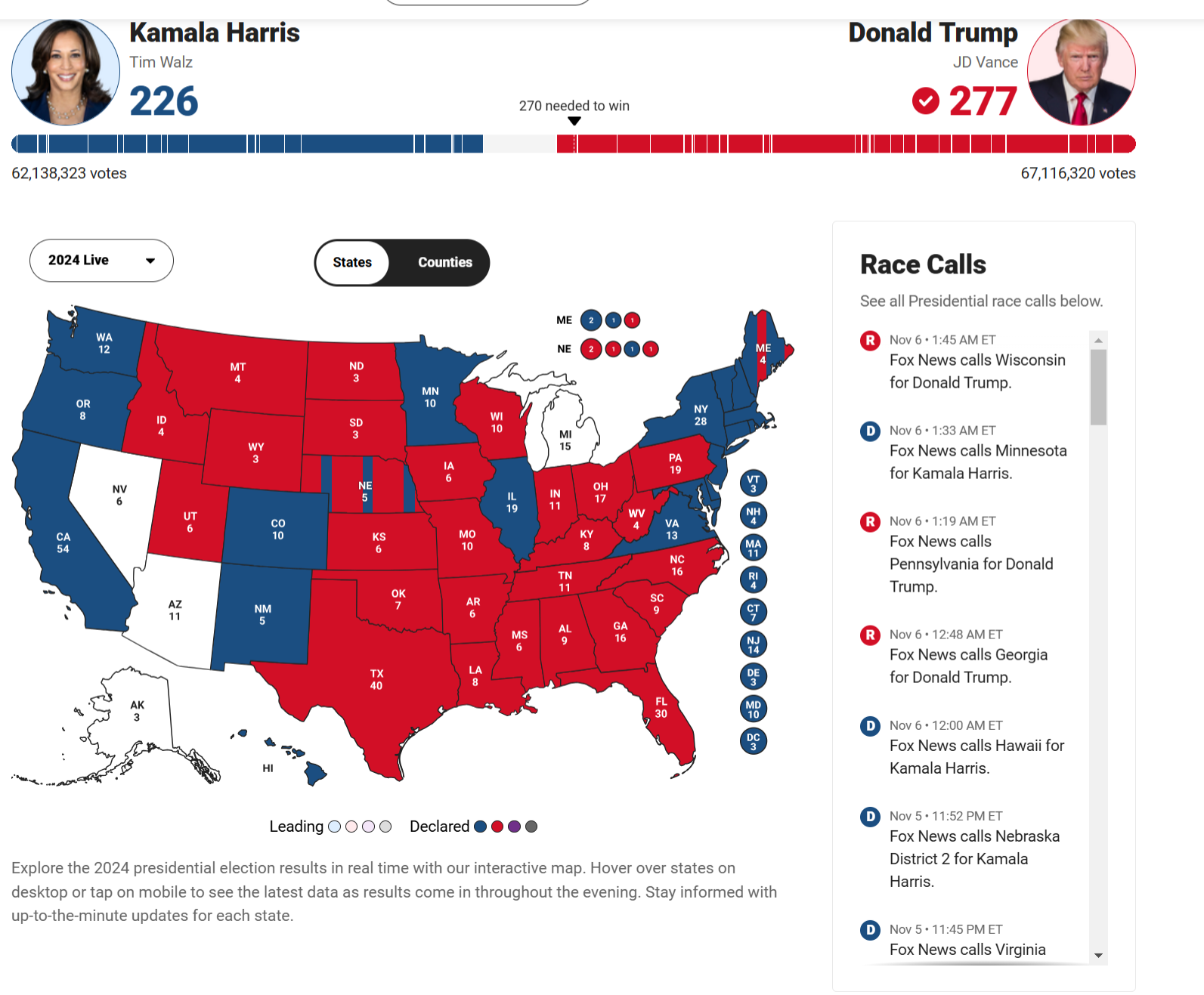 Fox News projected that Republican Donald Trump has won the U.S. presidency, defeating Democrat Kamala Harris and capping a stunning political comeback four years after he left the White House.