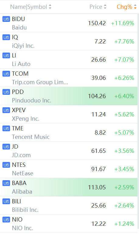 Baidu soared over 11%; Li Auto, iQiyi rose over 7%; Pinduoduo, XPeng rose about 6%; Alibaba, Bilibili rose over 2%.