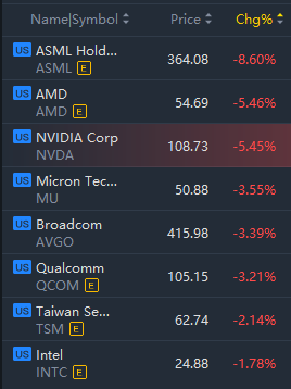 Major semiconductor stocks remained low in morning trading, with ASML Holding NV sliding over 8% and AMD sliding over 5%.