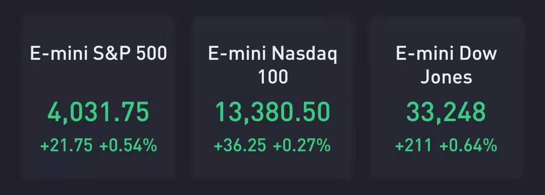 At 8:05 a.m. ET, Dow E-minis were up 211 points, or 0.64%, S&P 500 E-minis were up 21.75 points, or 0.54% and Nasdaq 100 E-minis were up 36.25 points, or 0.27%.