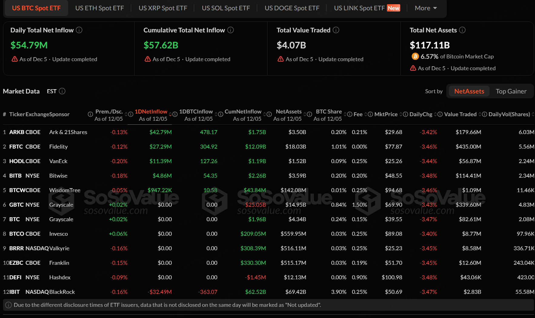 The Bitcoin spot ETF with the highest net inflow on December 5 was ARK 21Shares Bitcoin ETF (ARKB), with a net inflow of $42.79 million, according to SoSoValue.